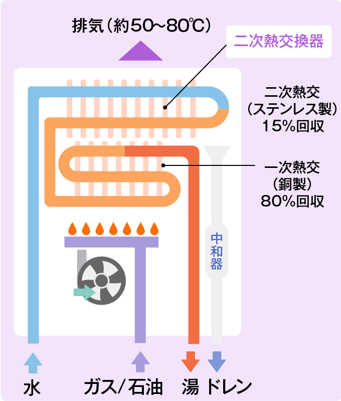 エコジョーズ/エコフィールは、従来型の給湯器で燃焼排ガスとして捨てていた熱をリサイクルすることで、熱効率を向上しています。その際に凝縮水(ドレン排水)が発生します。ドレン排水は通常酸性(pH3程度)ですが、中和器(炭酸カルシウムを充填)を通すことによりpH7程度の中性にして排出されます。